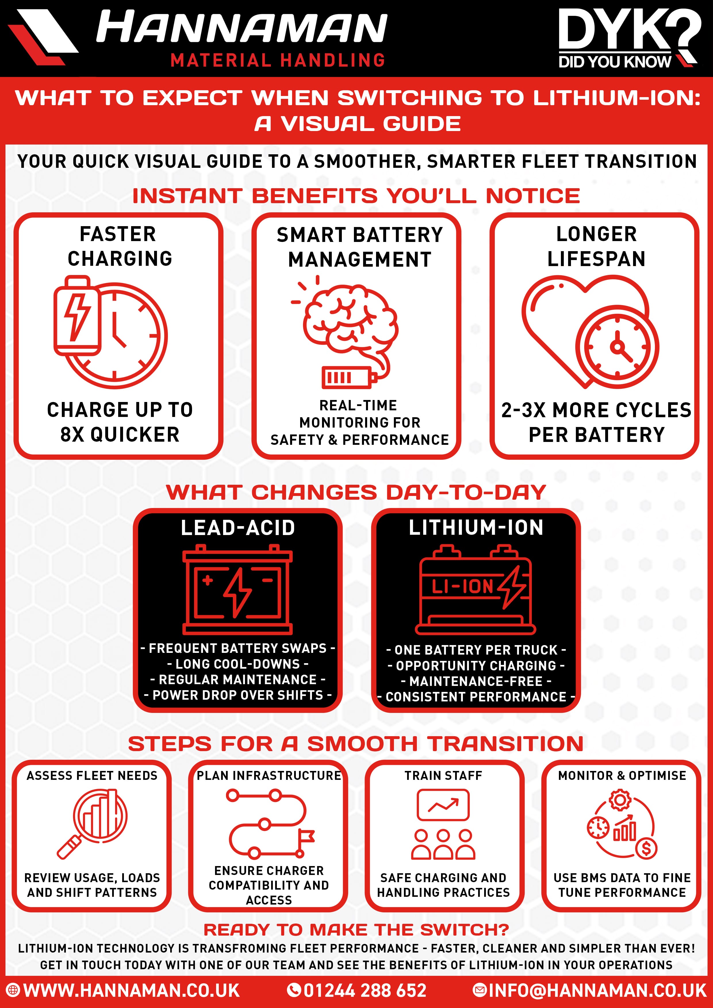 At Hannaman Material Handling, we’ve supported businesses across the UK in upgrading their fleets to lithium-ion technology — safely, efficiently, and with minimal disruption.